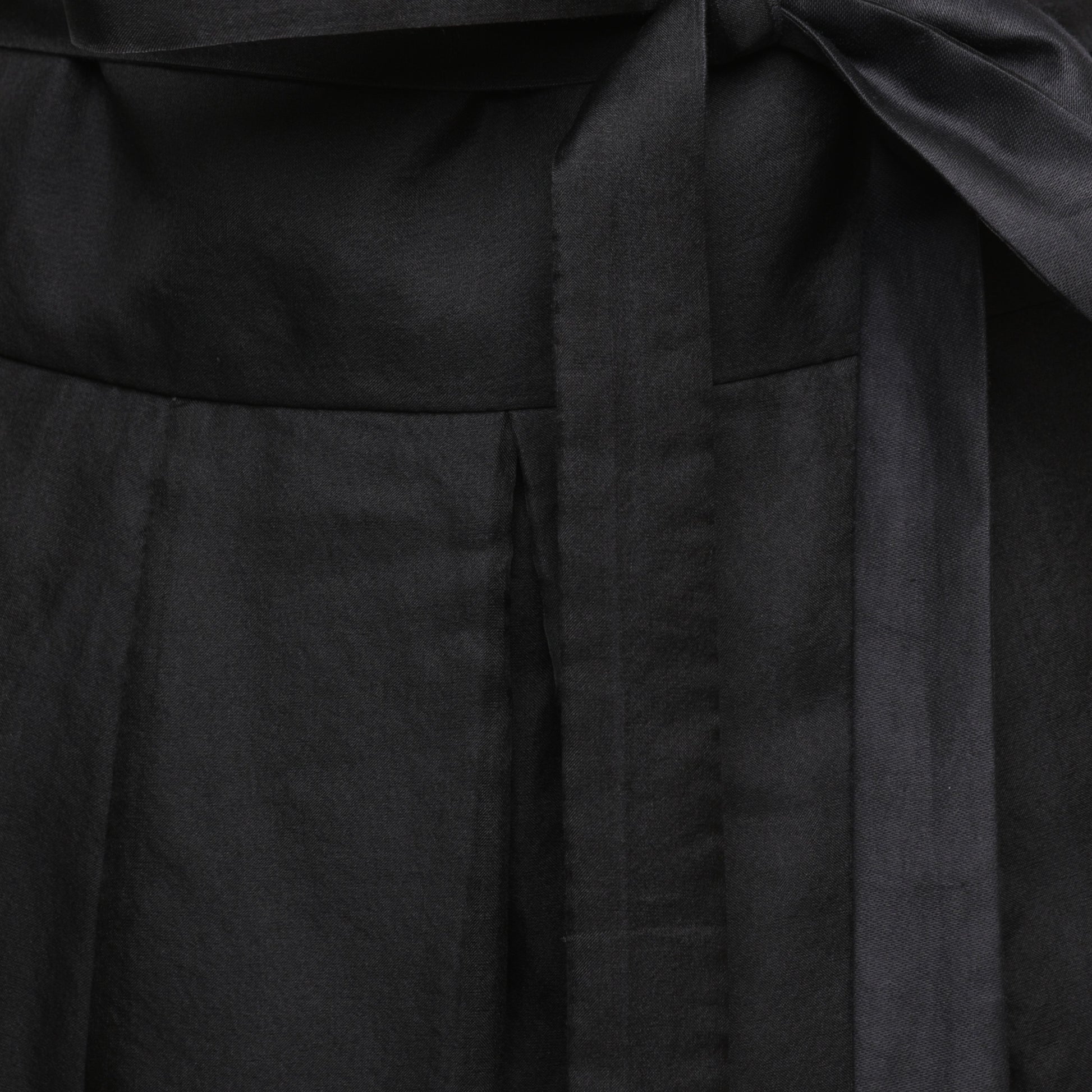 High-waisted and worn from front to back, this box pleated panel skirt wraps around and is fastened with a comfortable tie straps.