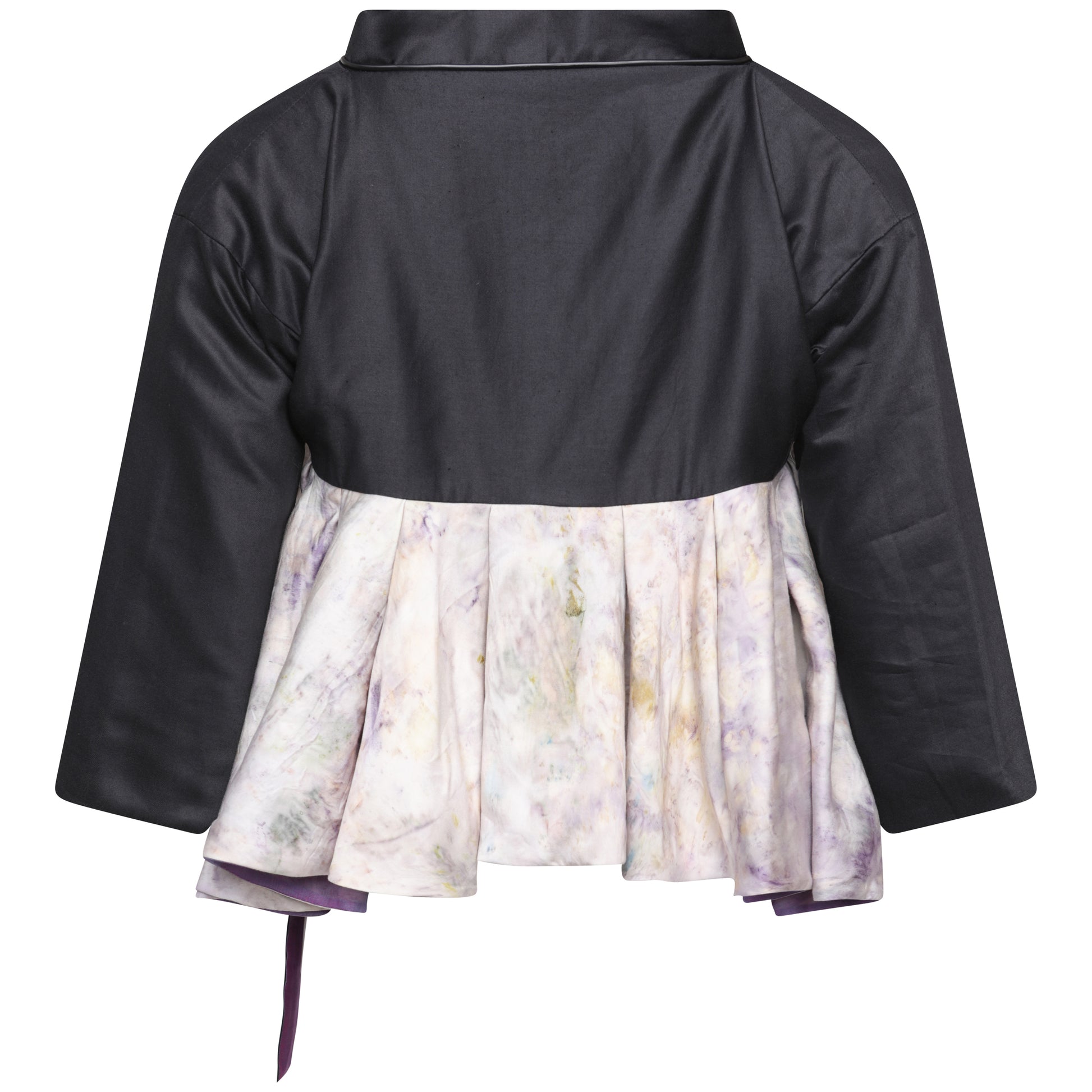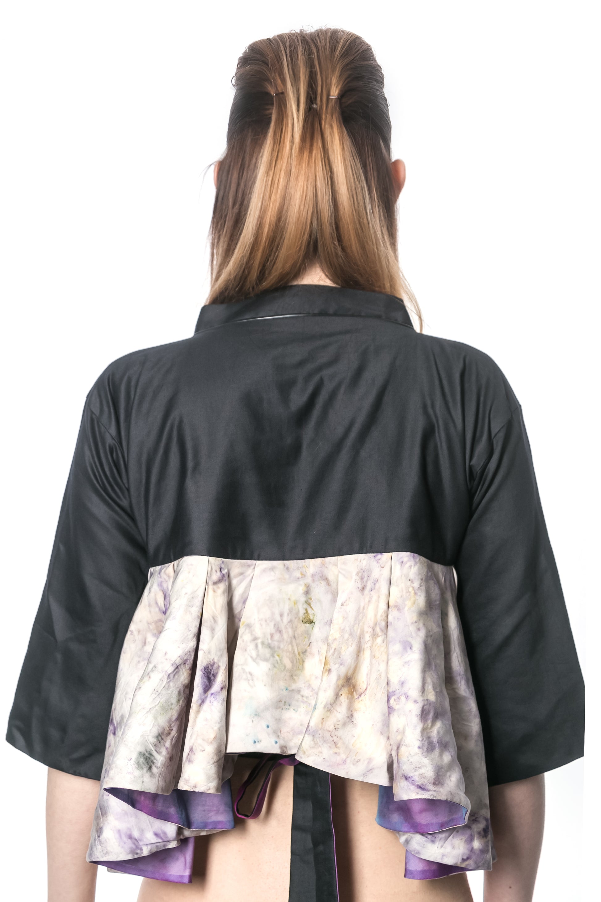 The blouse features a low-to-high dipped hem pleated peplum on the back with our own hand-dyed fabric, lined with jewel-like two toned ('shot') silk organza. Fastened with straps tied on back for maximum comfort.