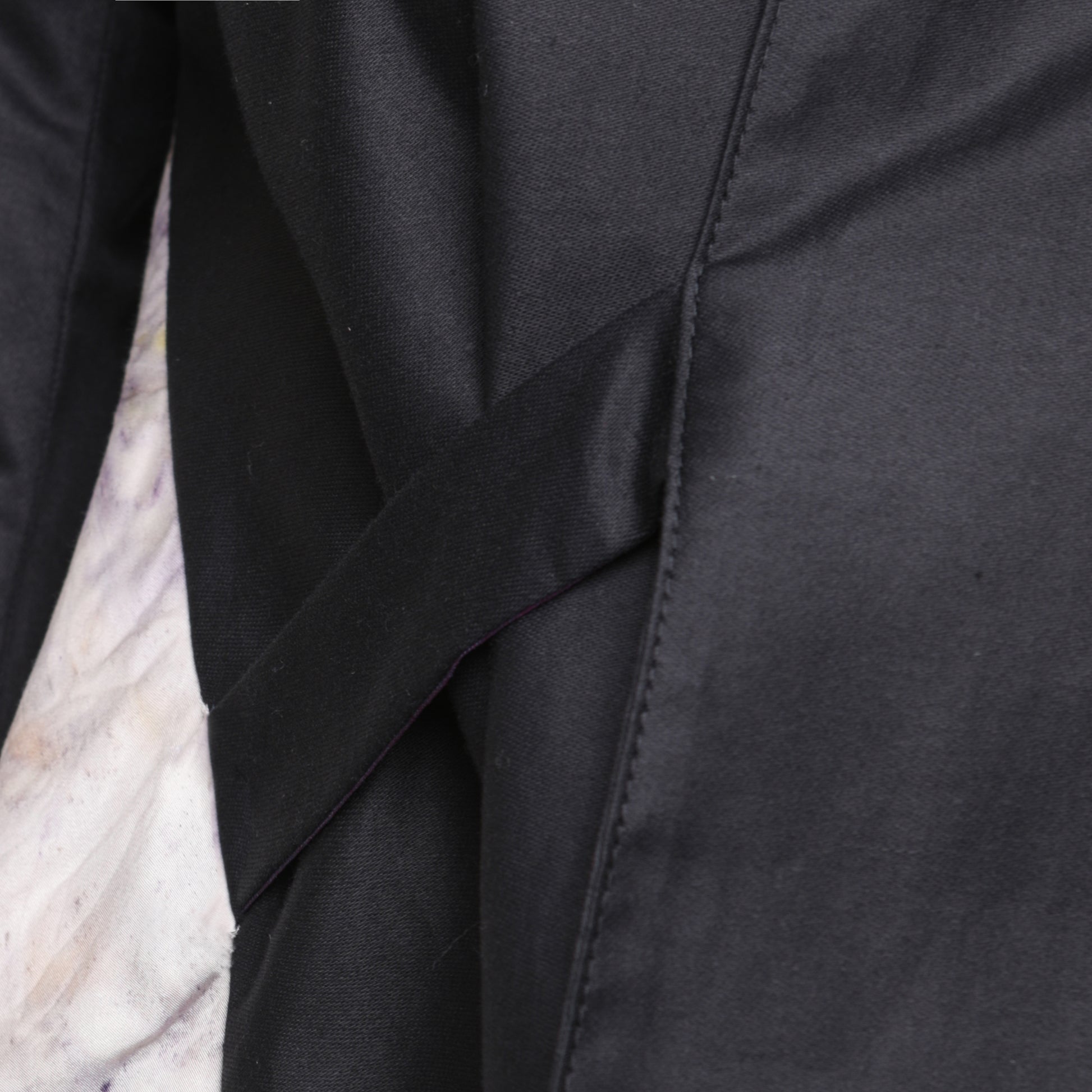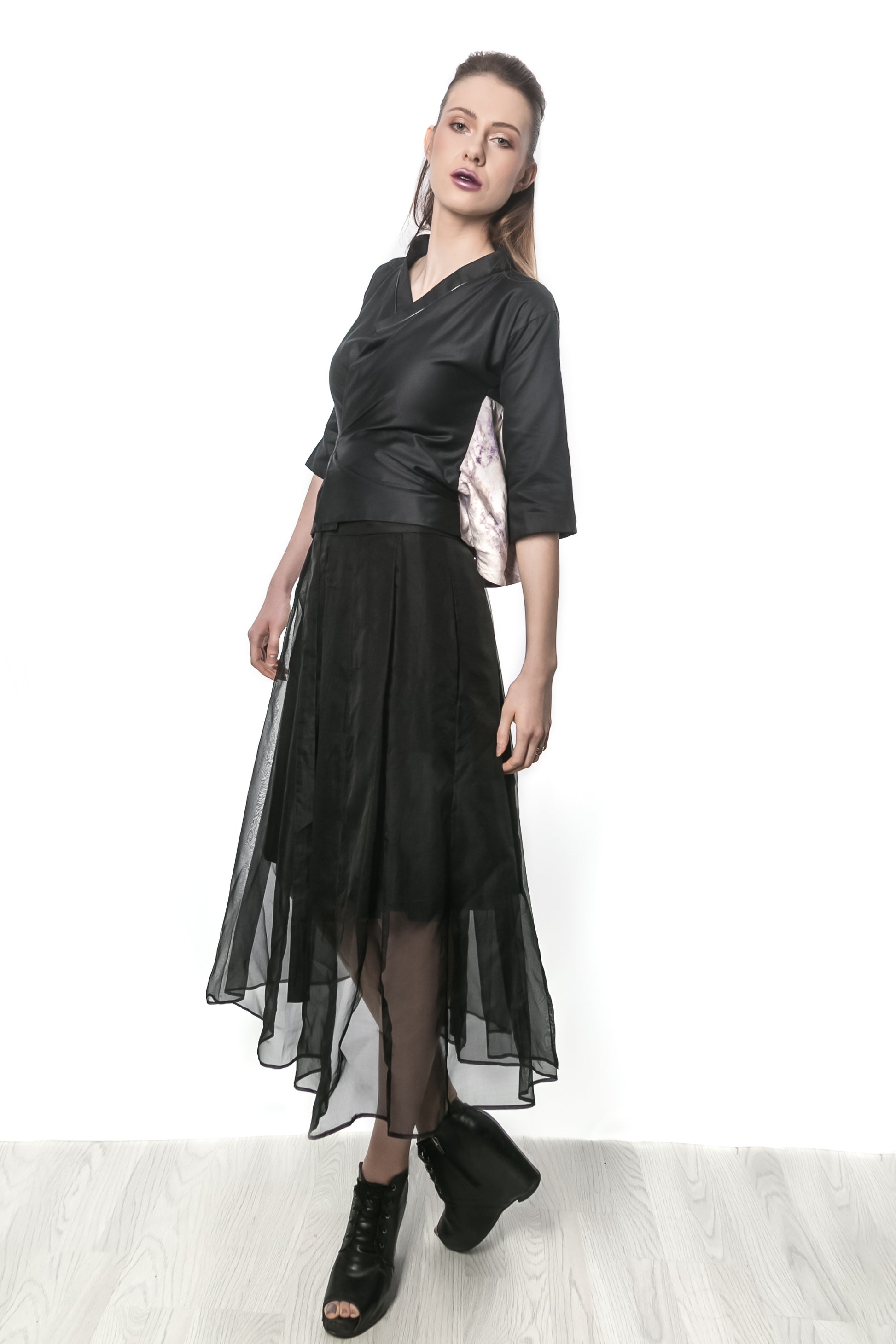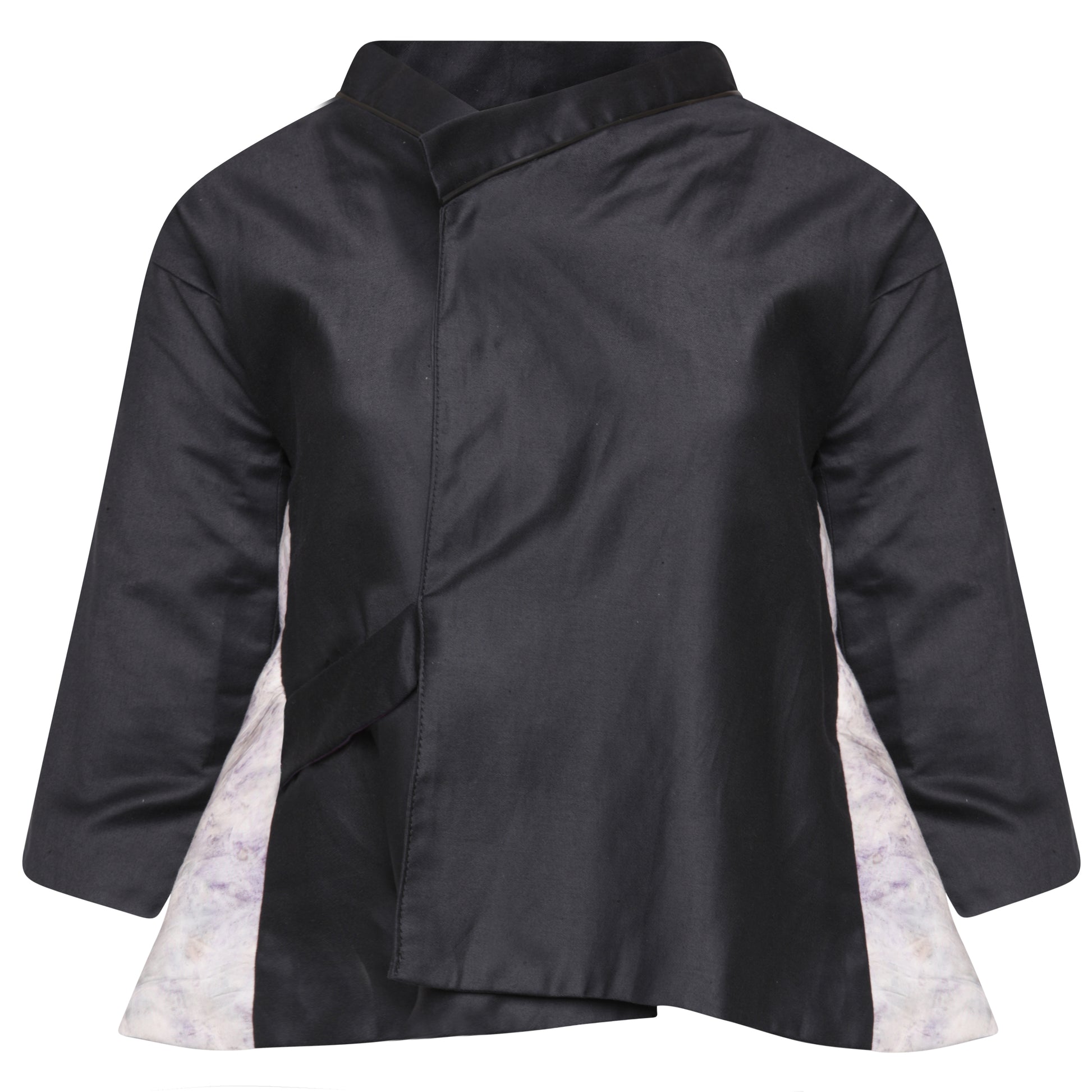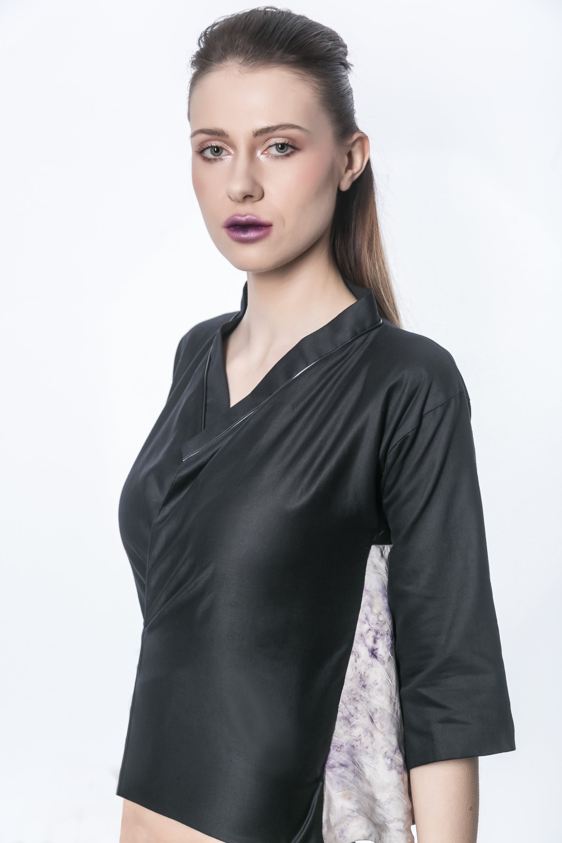 A truly unique design wrap-around blouse in luxurious low-sheen black sateen cotton featuring a Hanbok flat collar and a wrap over closure.