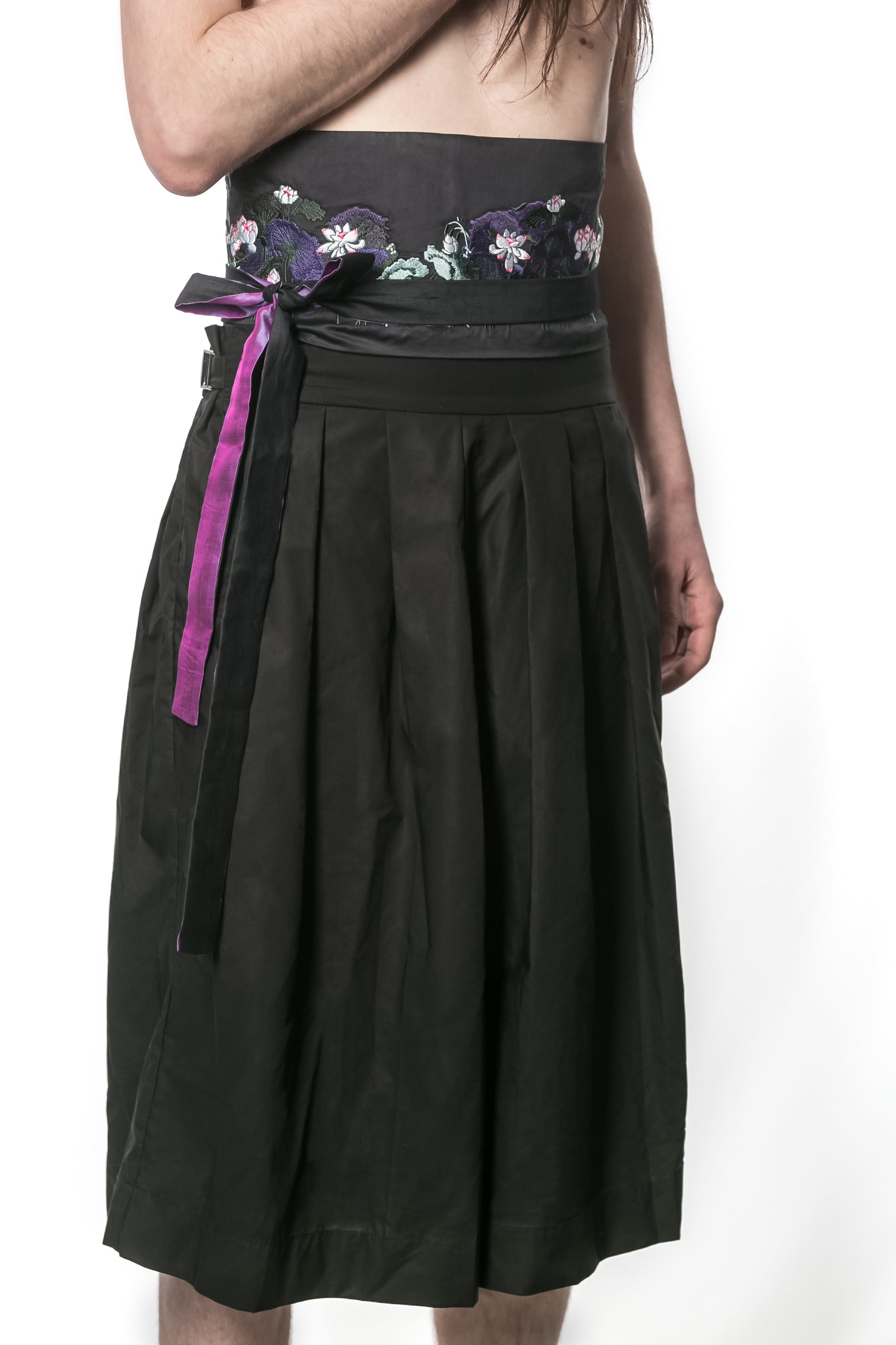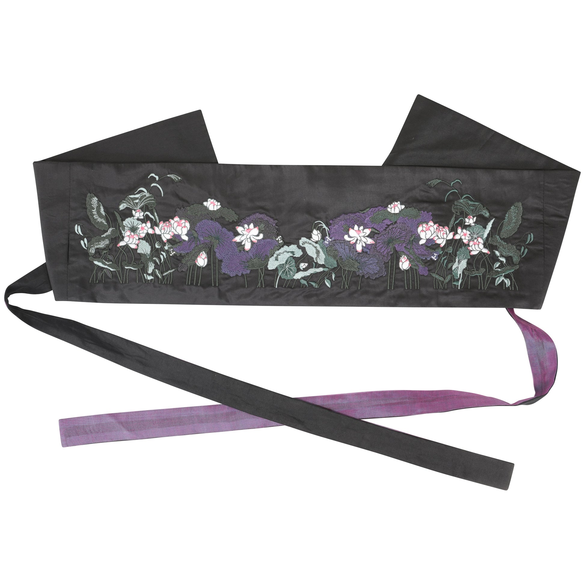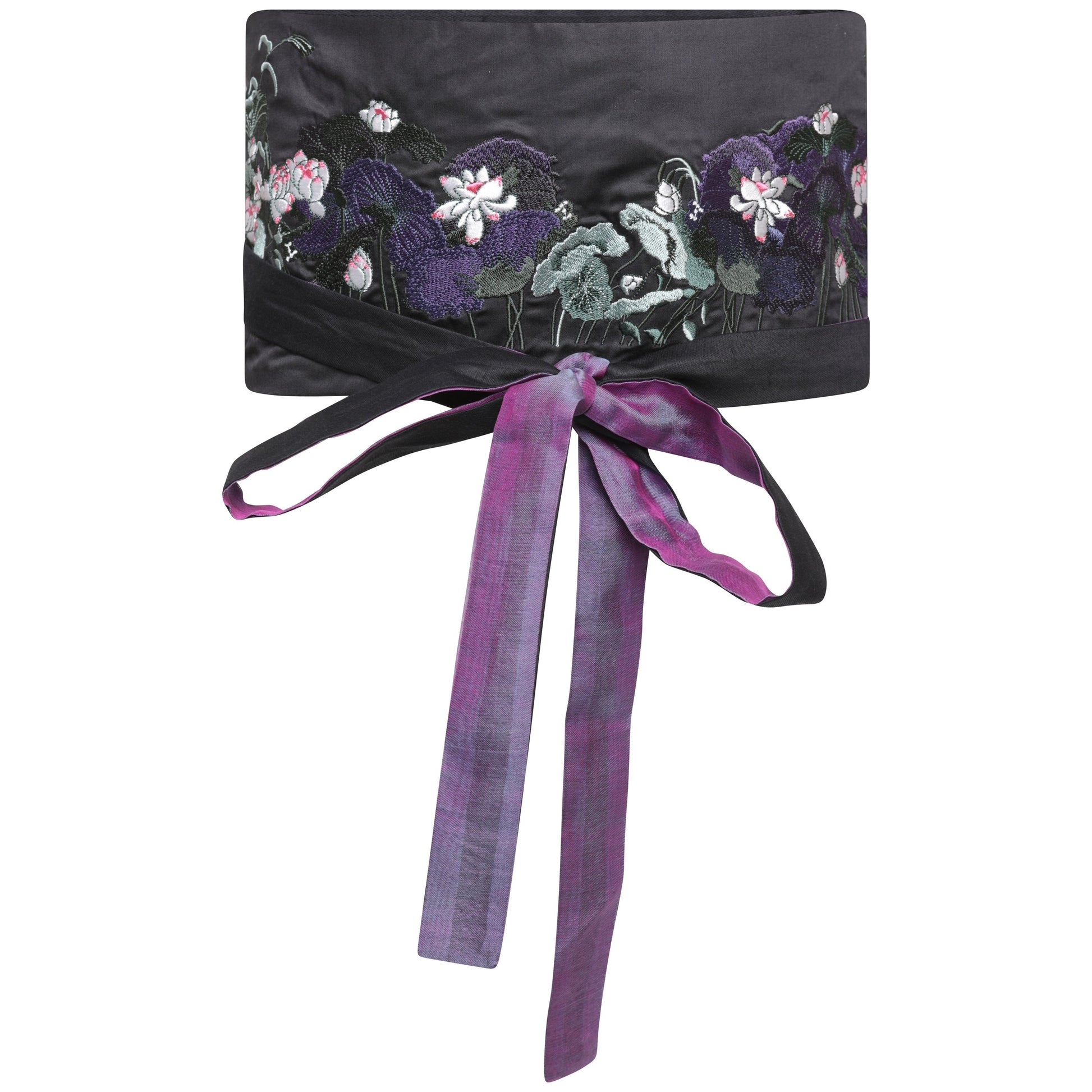 This beautifully unique and versatile fabric belt is a great, fashionable addition to any boring outfits. HORITI is a wide waist fabric belt, featuring a stunningly serene lotus scene, designed in-house by Souhui, embroidered on smooth bamboo silk. The subtle sheen adds to the luxury!