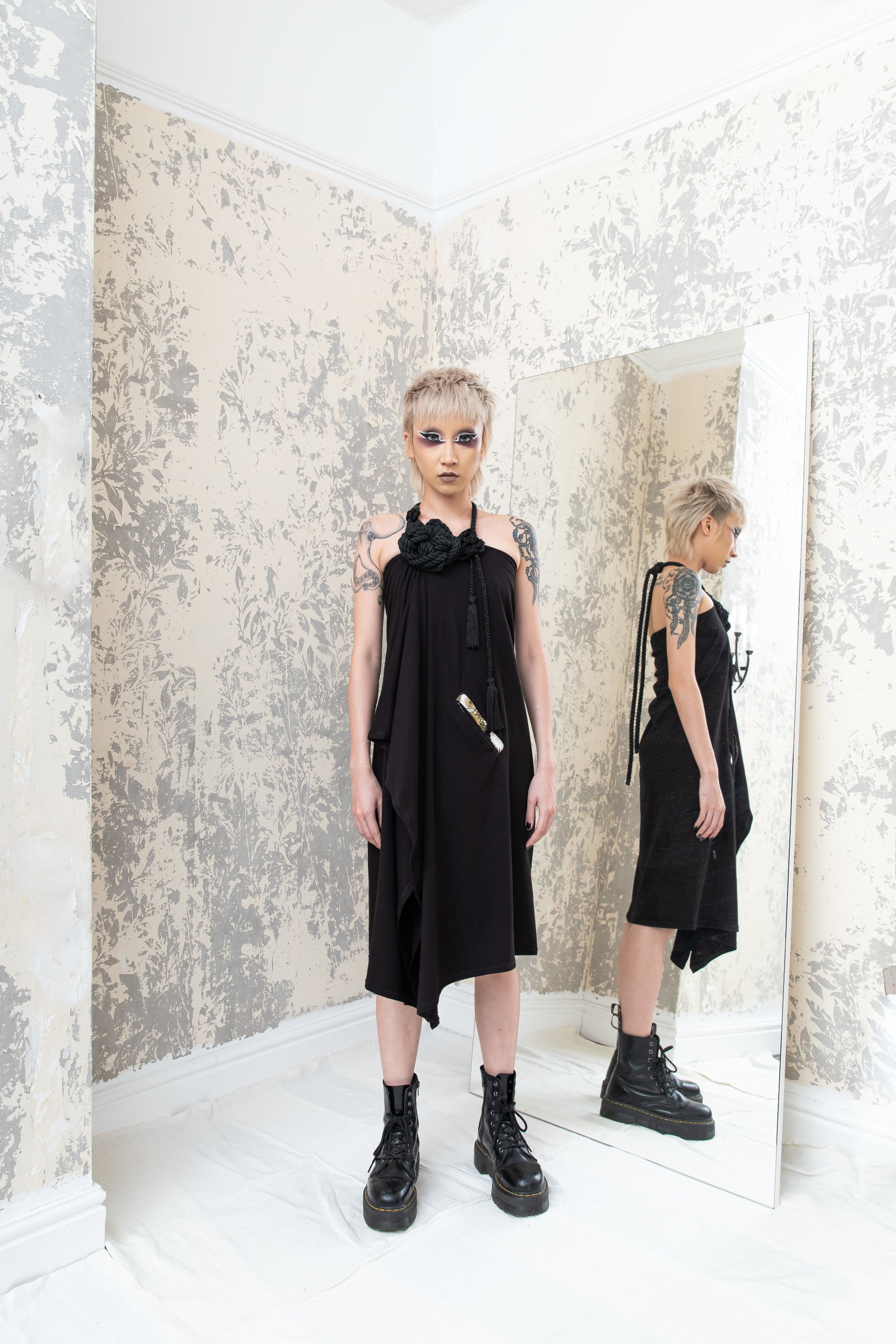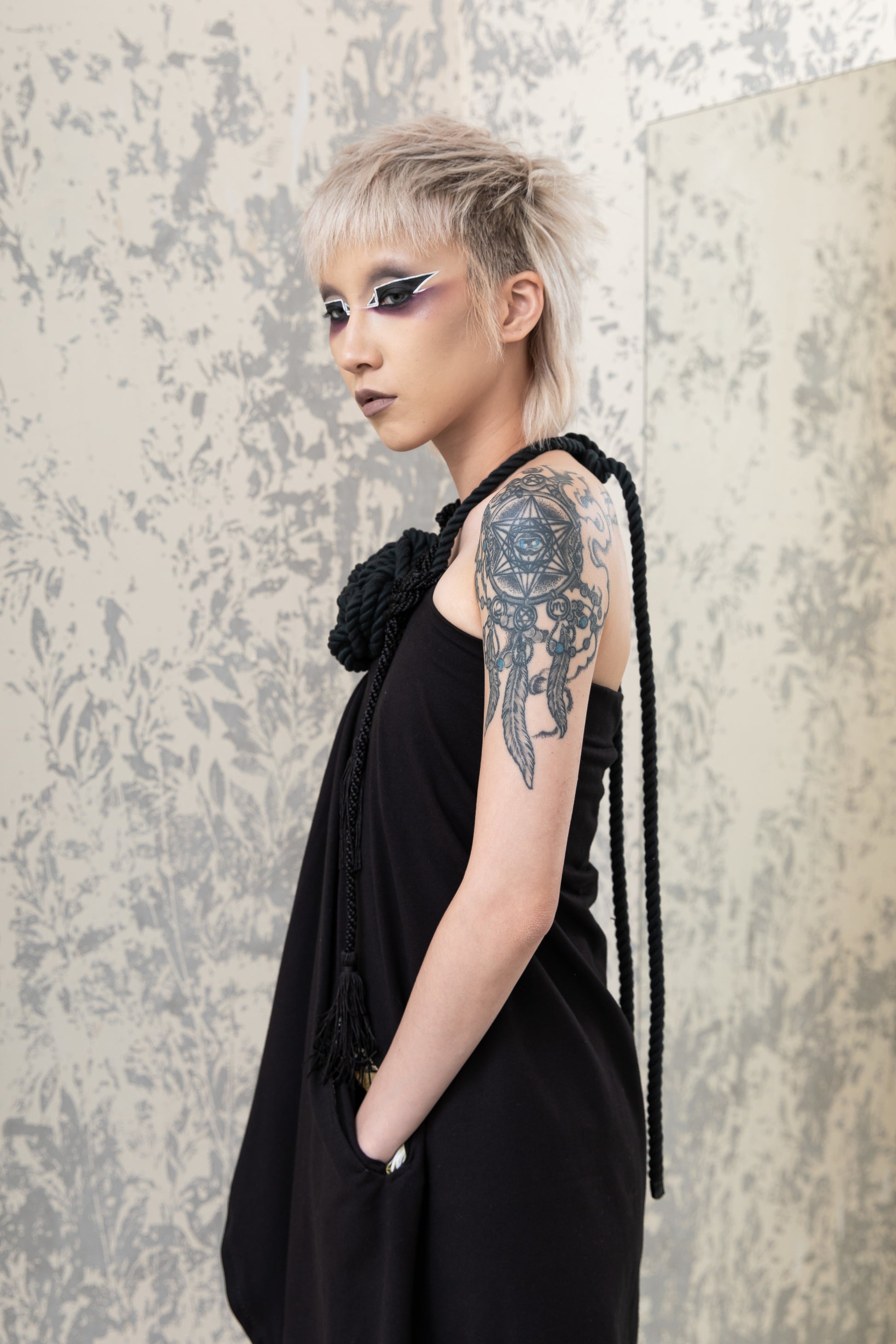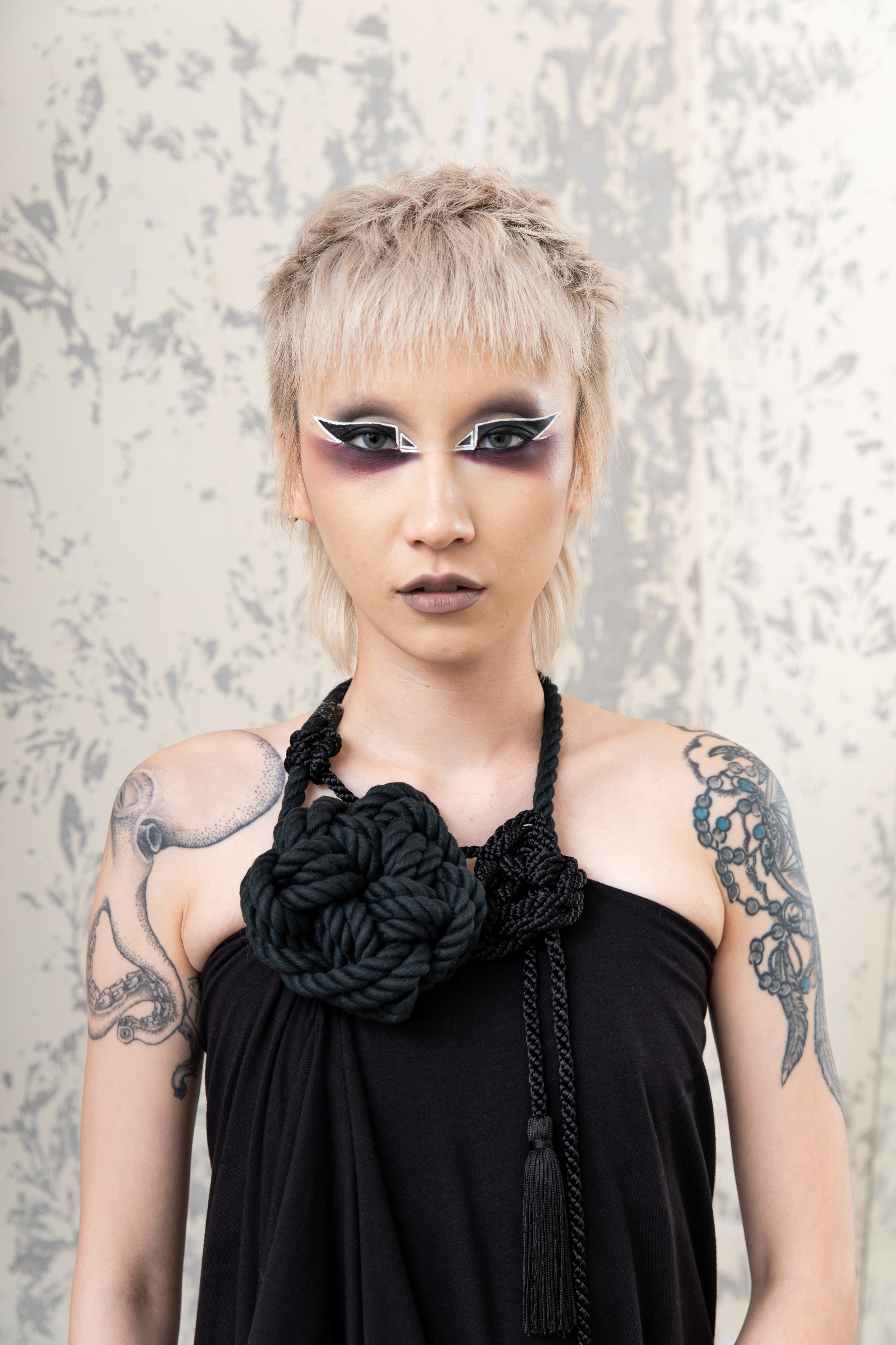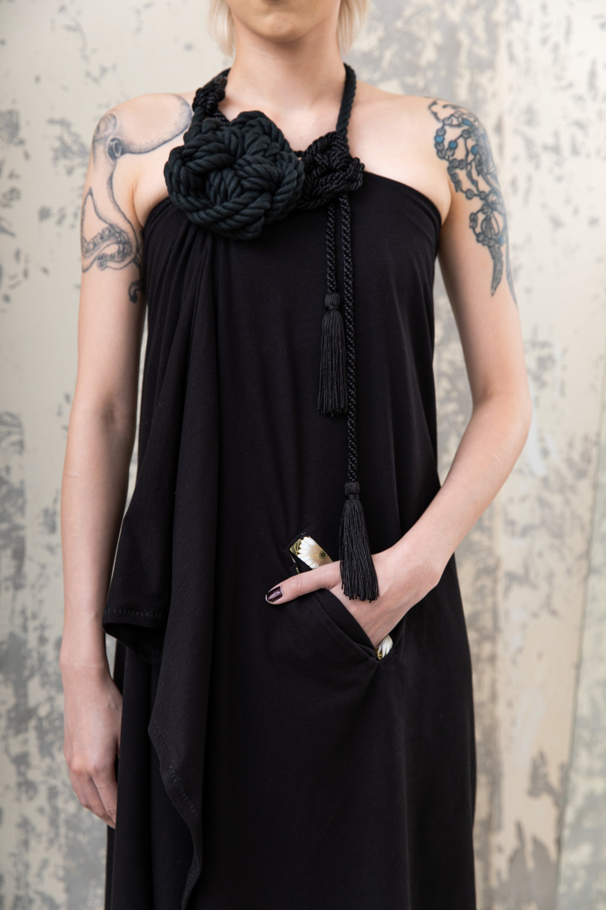 KNOTS dress features two large handmade corsages of Korean traditional garackji (ring) knots, the larger of the two made from 10mm cotton rope and the other from 4mm braided satin cotton rope. Complementing these knots are two hanging cotton rope tassel tie details.
