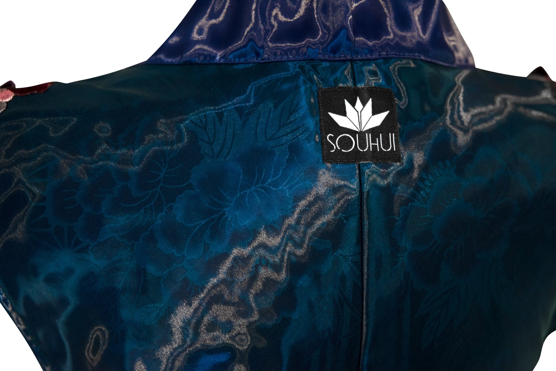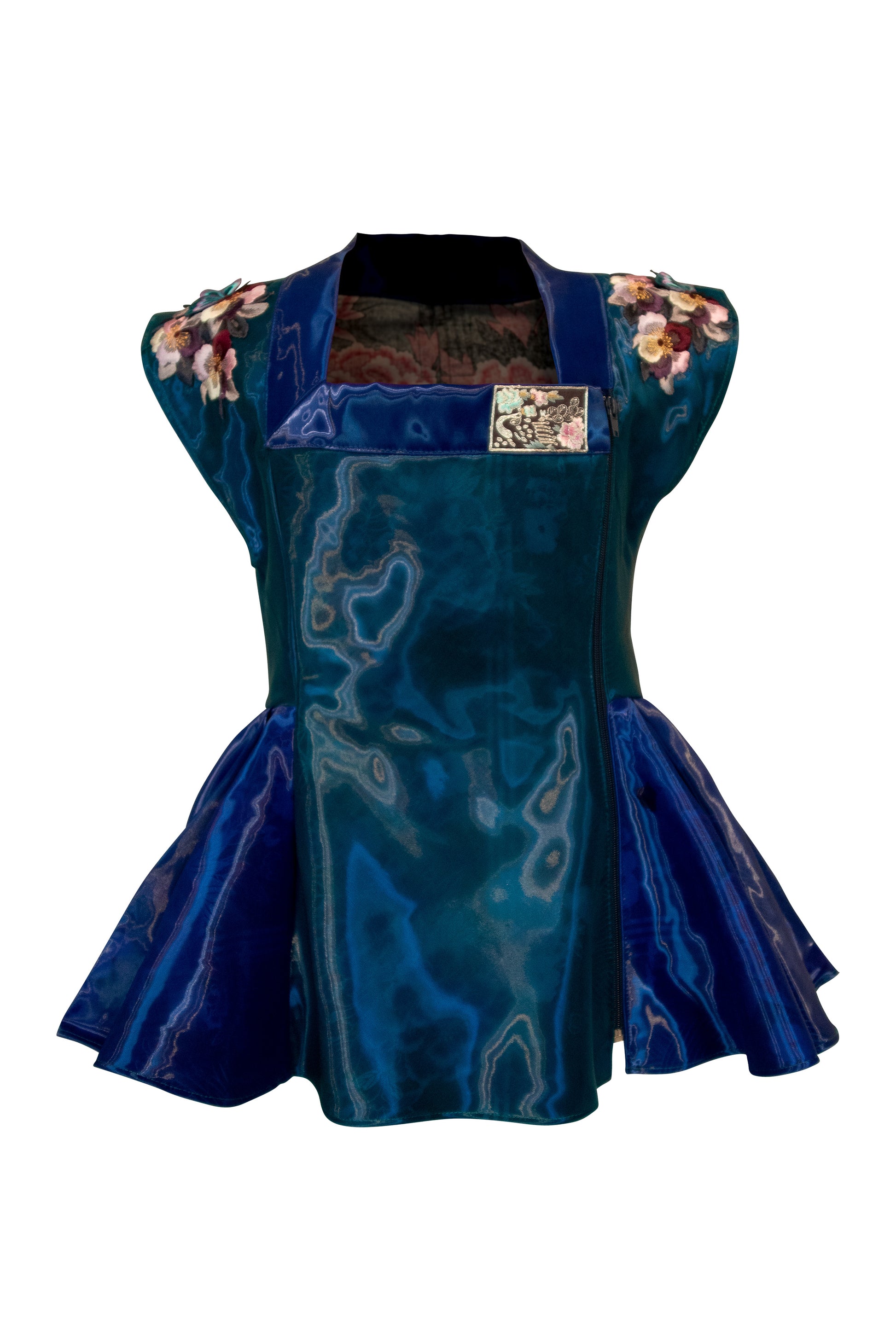 Bias-cut (cut on the 'bias' - diagonal from the thread direction/grain of the fabric) top made of "liquid metal" heavy organza in autumnal sky teal and royal blue, lined with premium Japanese flower printed cotton that subtly shows under the blue. Truly a special item!