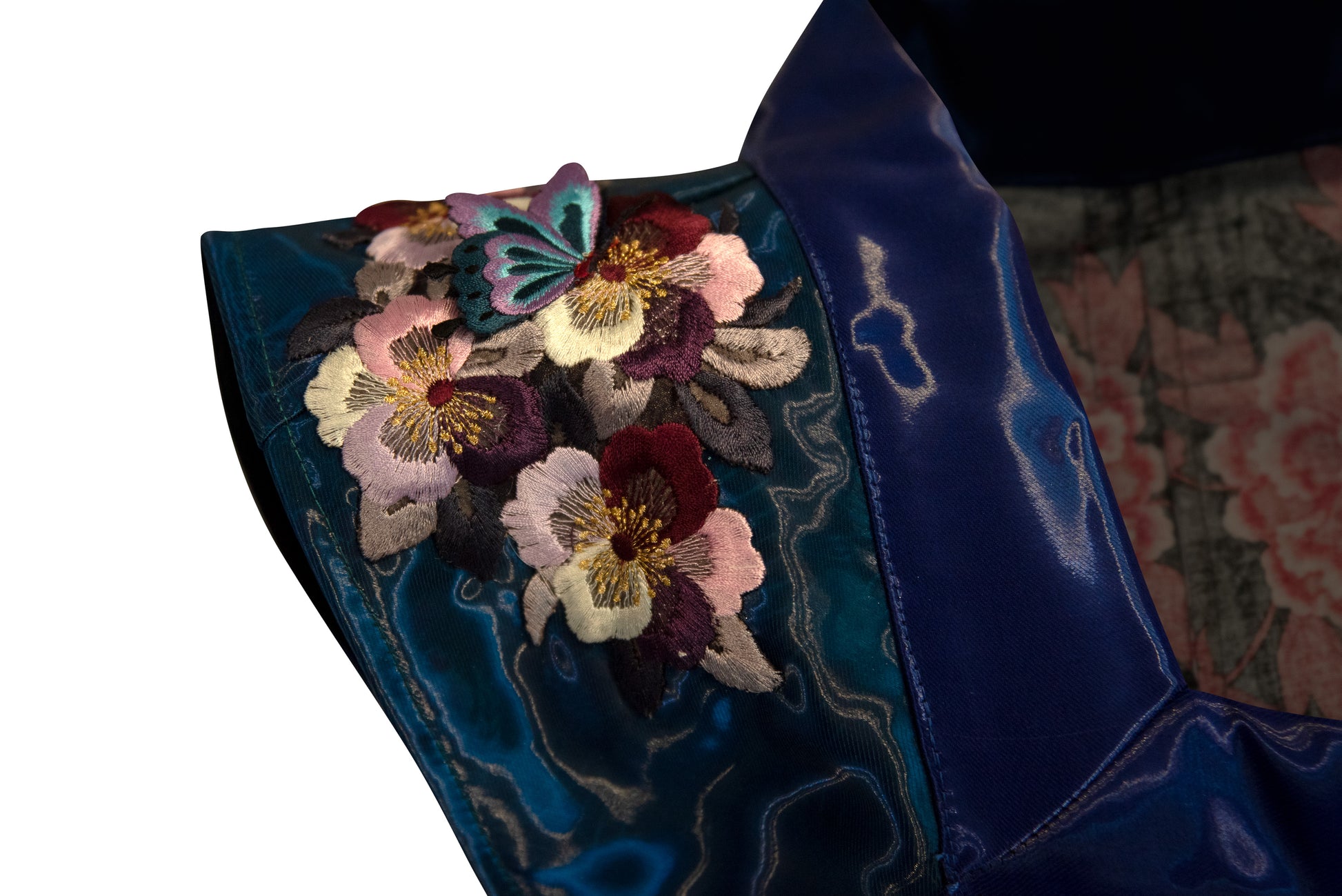 Beautiful embroidered flowers and 3D butterflies in muted colours on both shoulders.