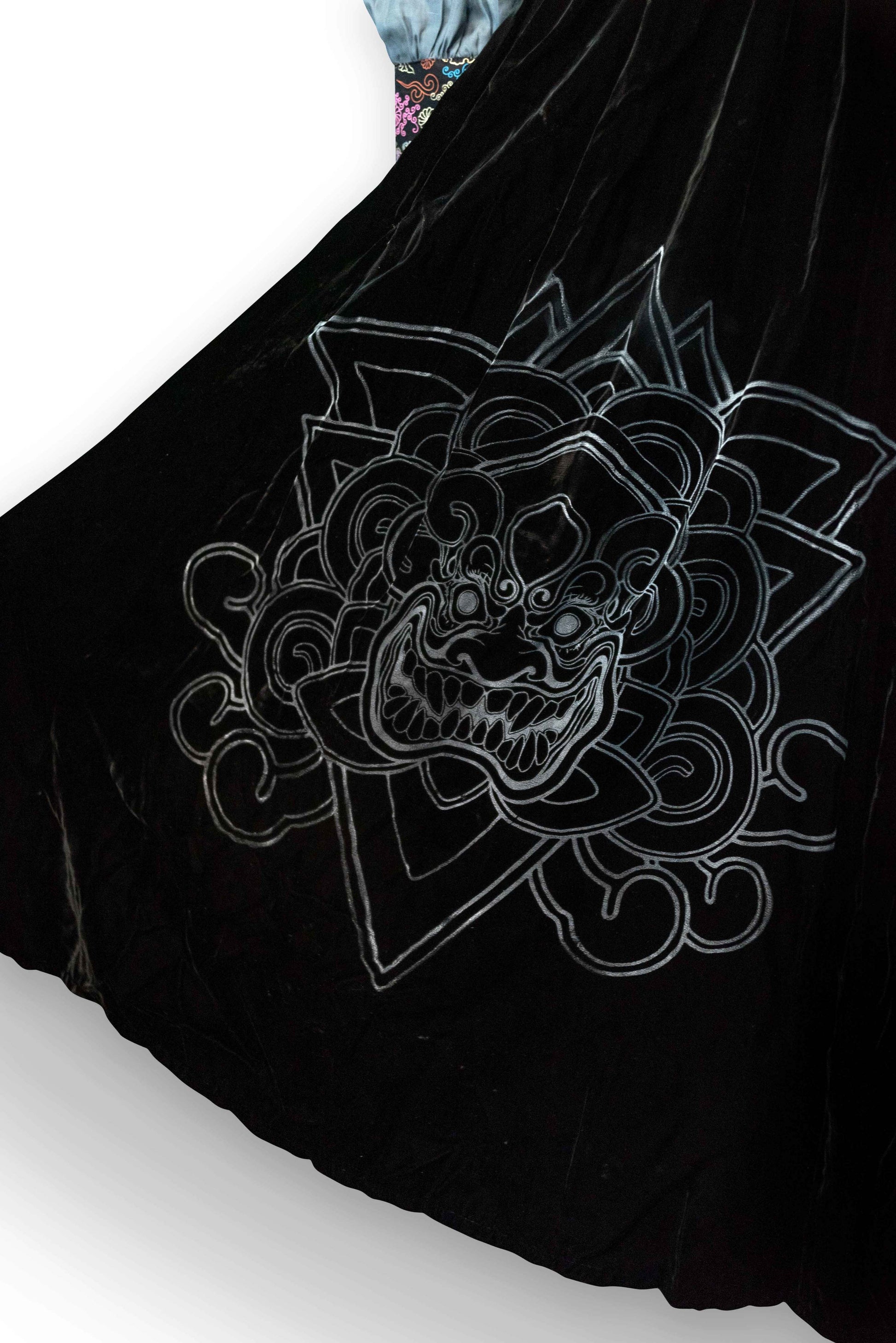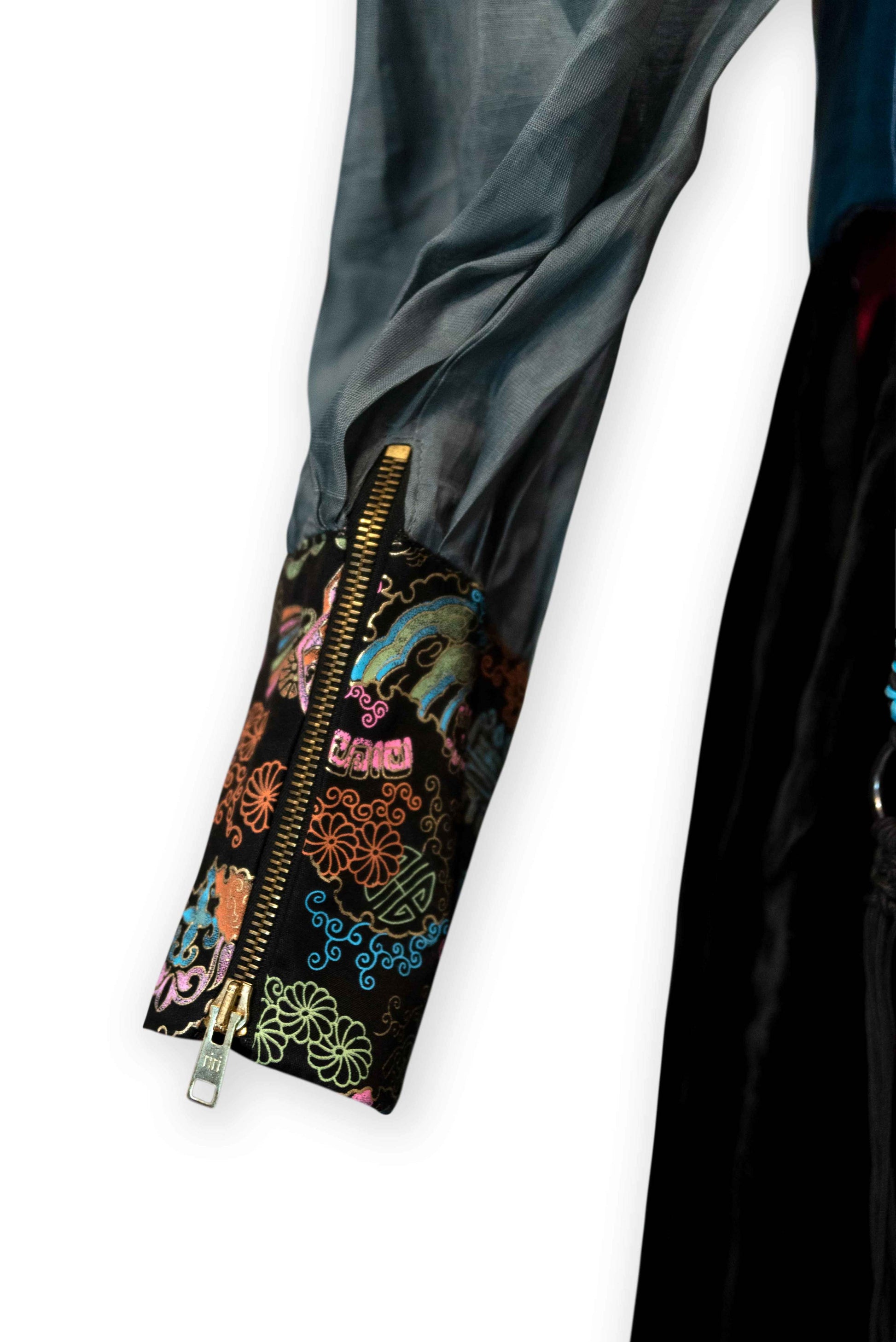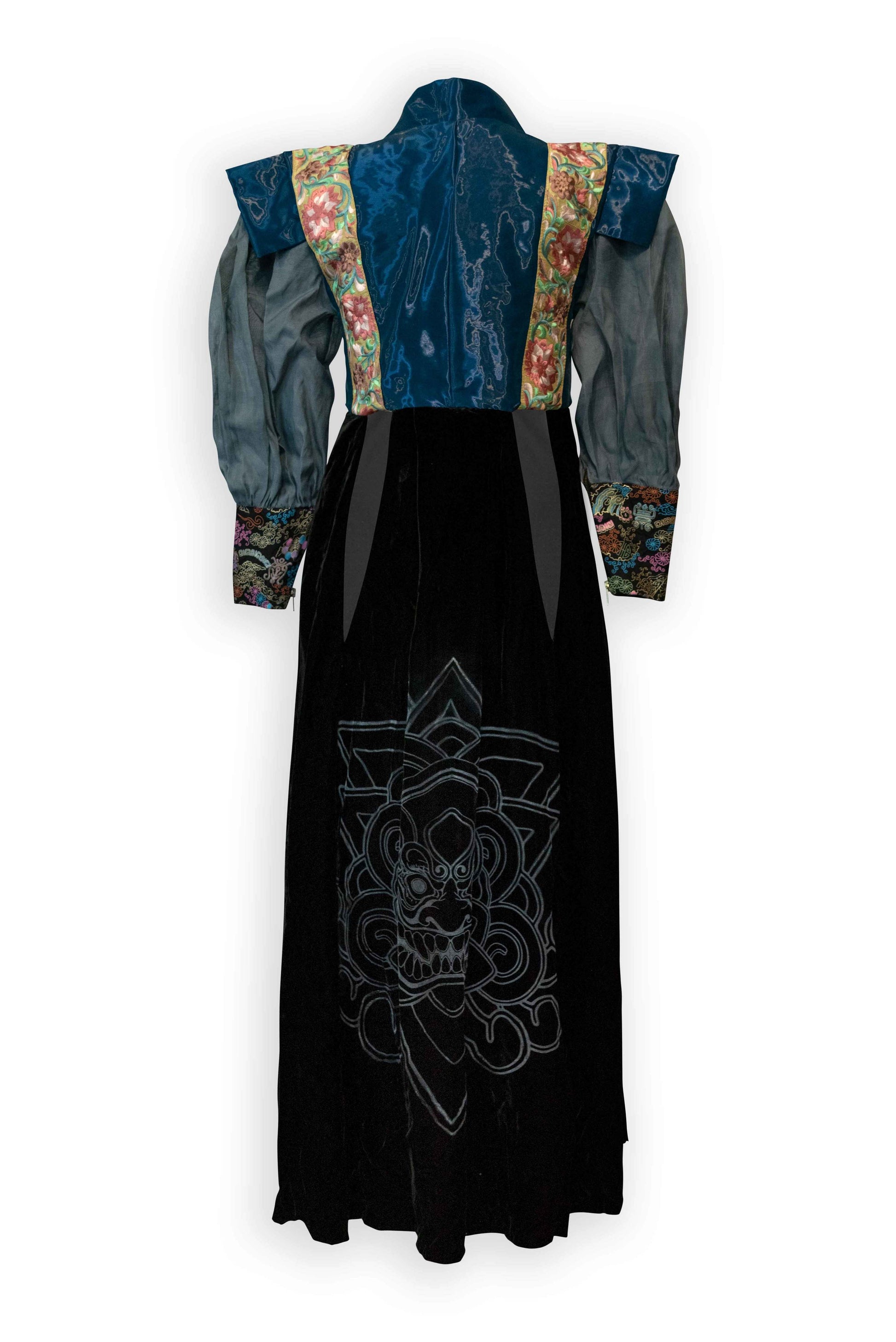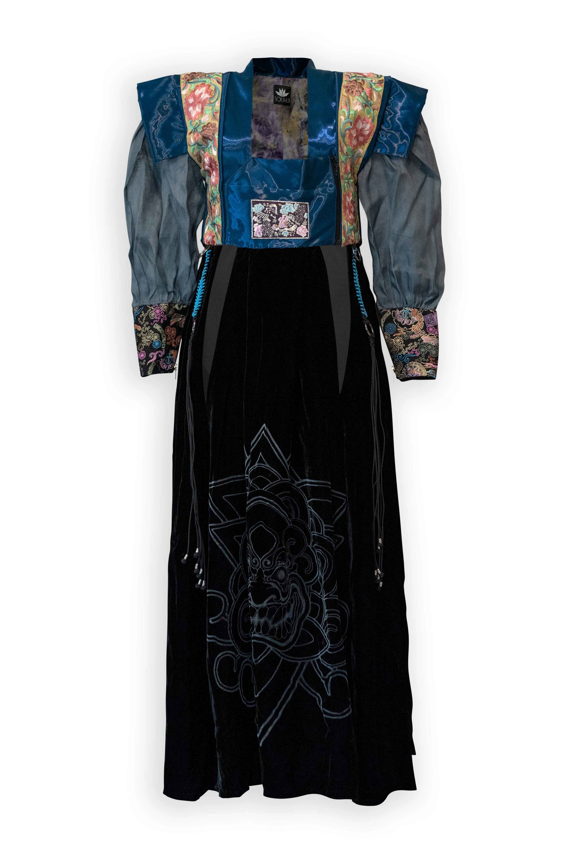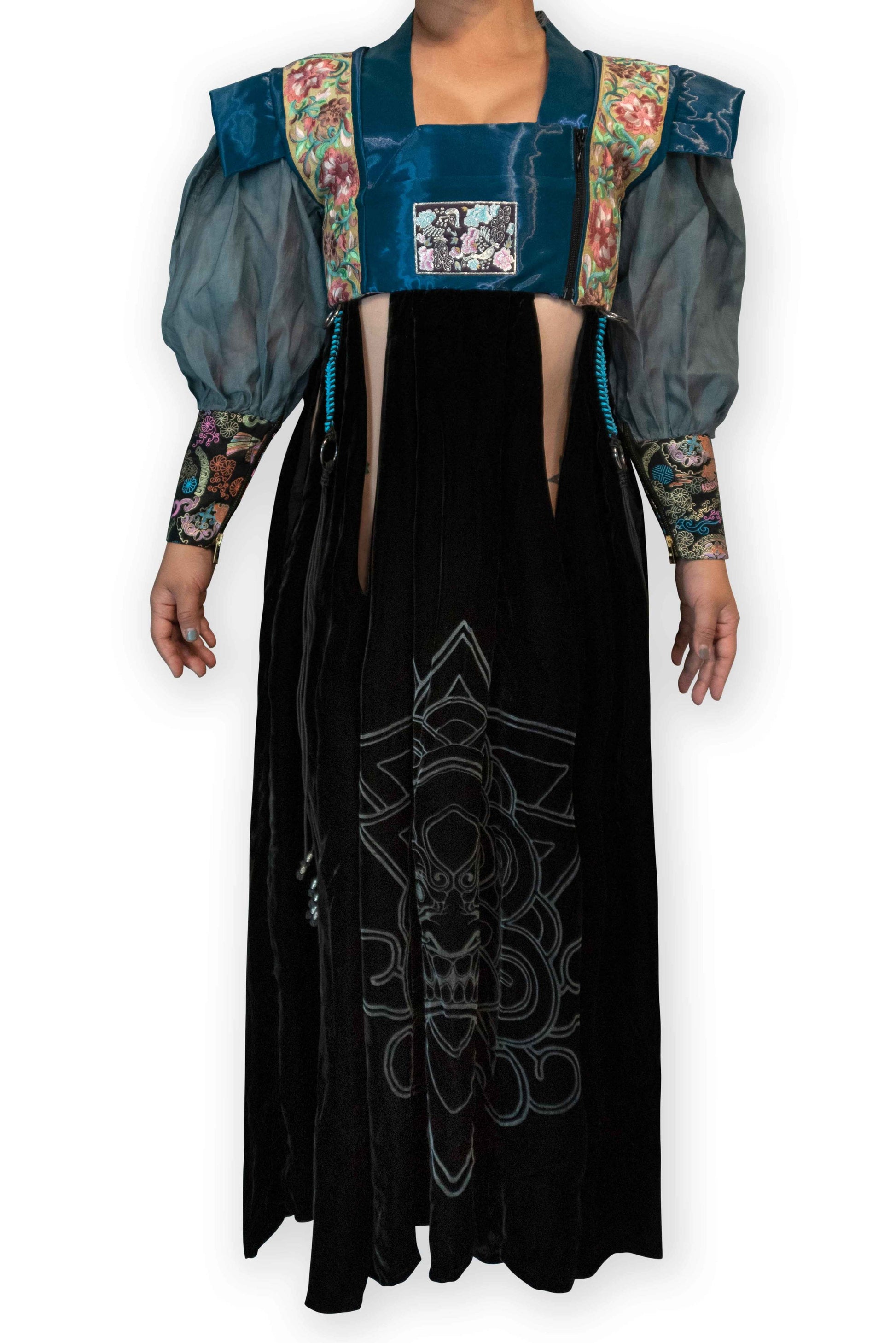 Made from "Liquid Metal" silk and polymide organza, softest plush silk velvet and Oksa (silk fibers woven in traditional Korean way). Adorned with gold zips on cuff and hand knotted hardware sewn on top of the skirt.