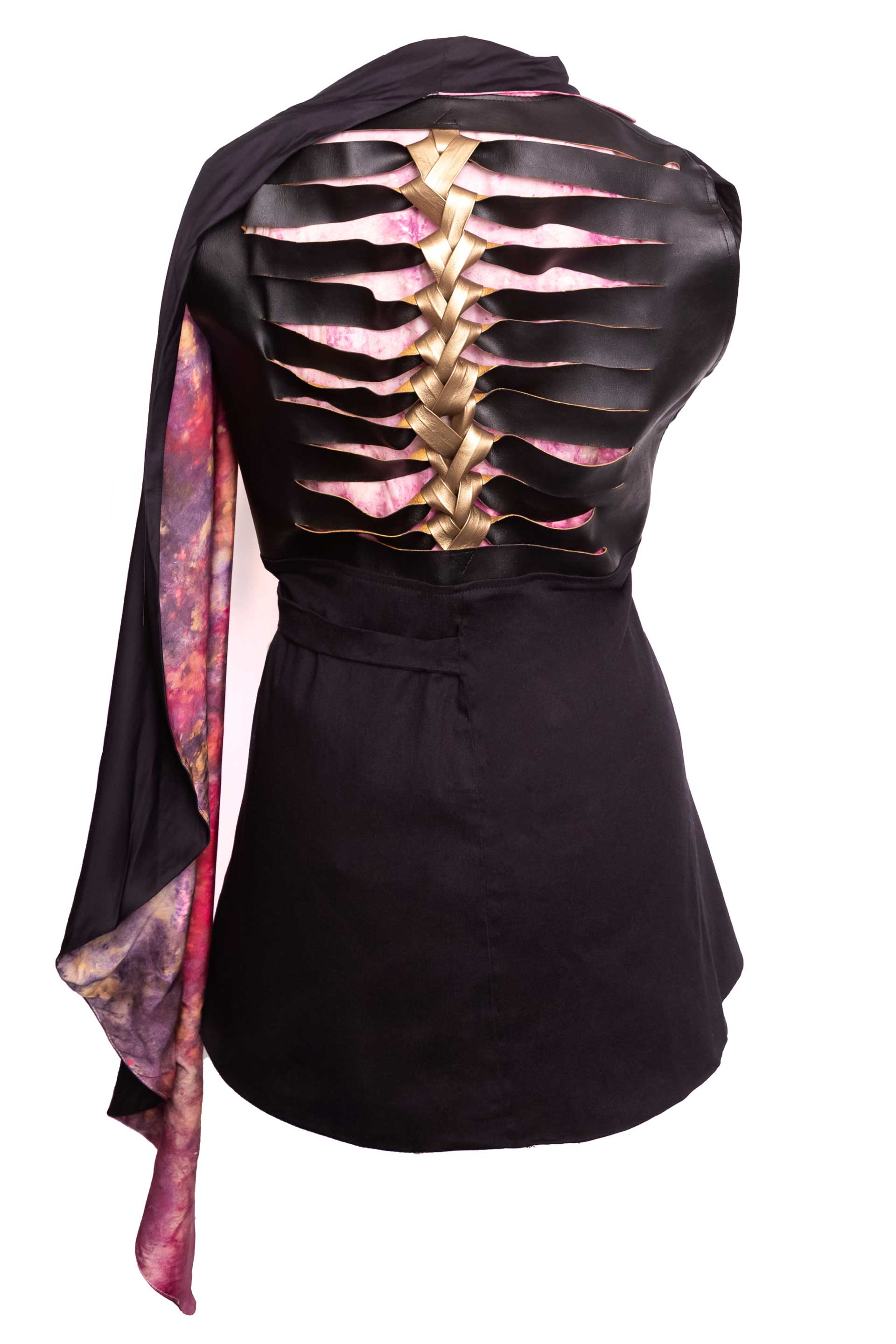 The draped collar is longer than the body, so wear it however you would like - draped over the shoulder like a fancy cape, or swept over the front like a beautiful scarf. The back is adorned with sliced open panel of faux leather, revealing the hand-dyed bamboo silk underneath the golden braided spine.