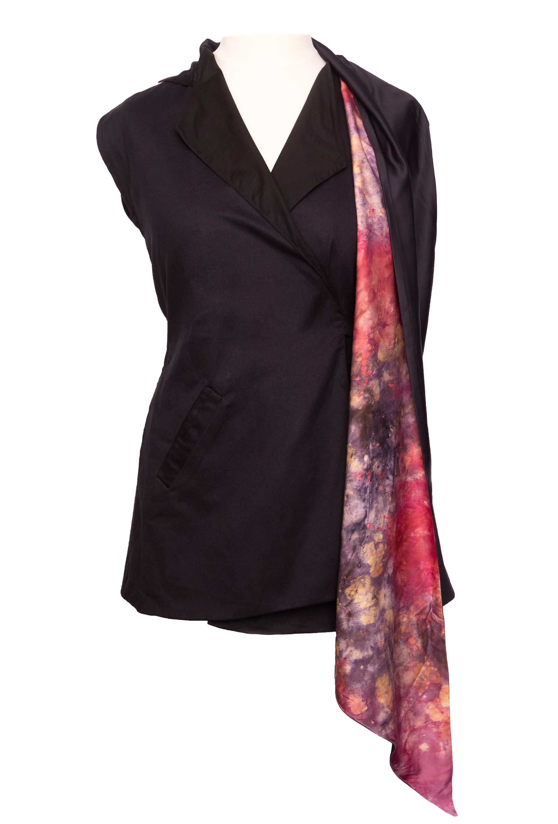 The blazer dress is mid- thigh length, and wrapped closure with straps has double jetted pockets on each side. Left side has a classic lapel detail to keep the formality. The other side with long, draped collar made of beautifully luscious black bamboo silk, lined under with vibrant hand-dyed bamboo silk.